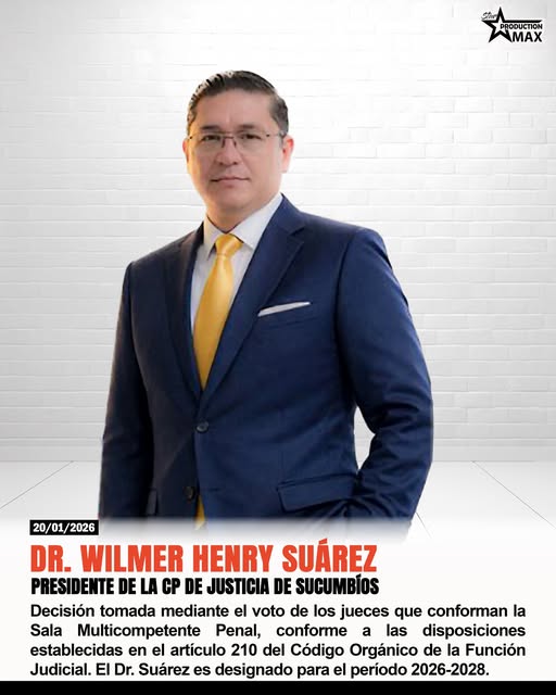 La Corte Provincial de Justicia de Sucumbíos ha designado a su nuevo presidente para el período 2026-2028. El cargo será asumido por el doctor Wilmer Henry Suárez Jácome, decisión tomada mediante el voto de los jueces que conforman la Sala Multicompetente Penal, conforme a las disposiciones establecidas en el artículo 210 del Código Orgánico de la Función Judicial.